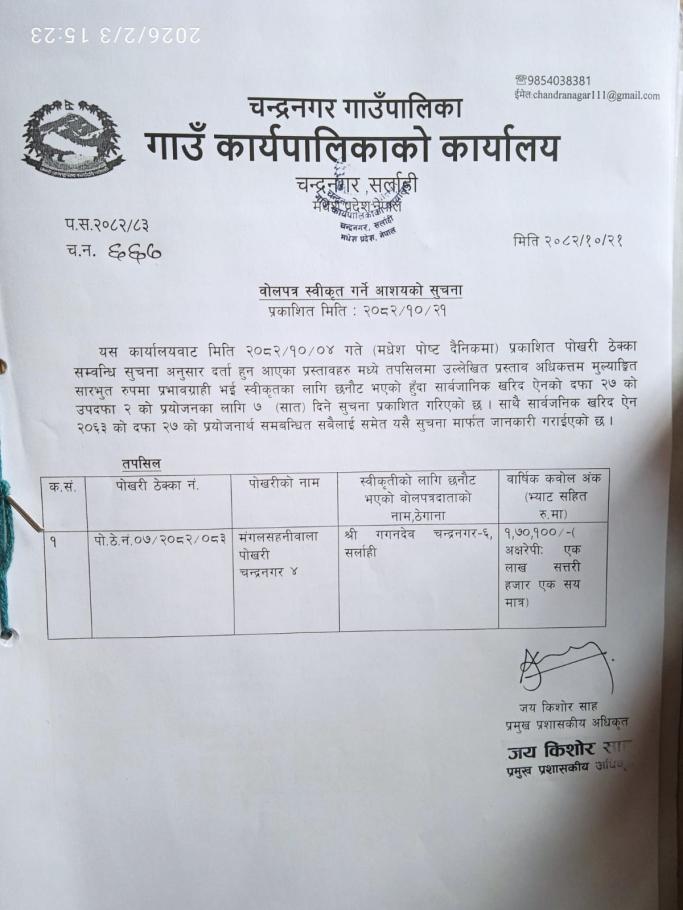 वोलपत्र स्विकृत गर्ने आसयकाे सूचना ।