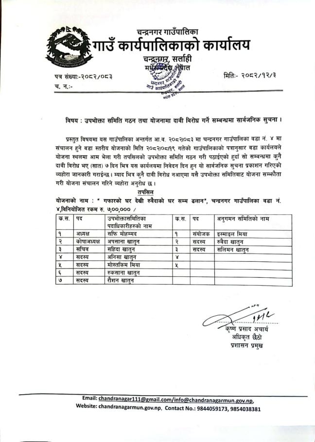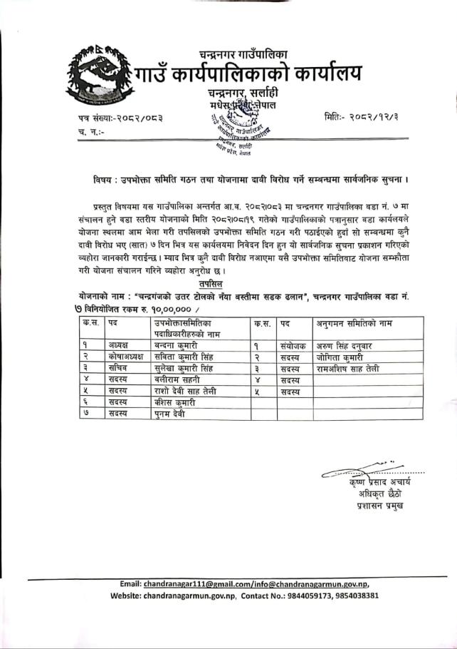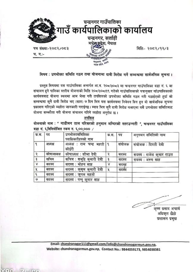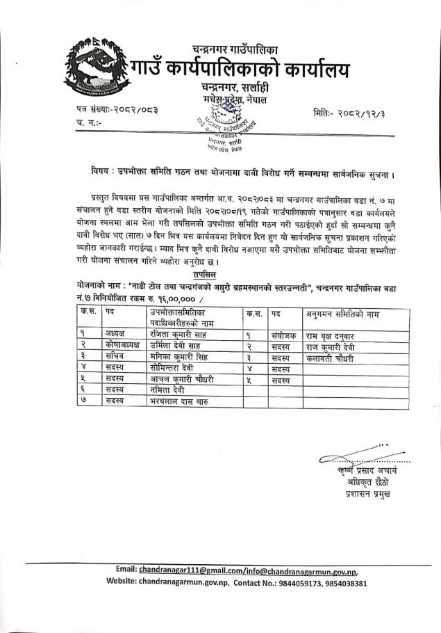 उपभोक्ता समिति गठन तथा दाबी बिरोध को सूचना |