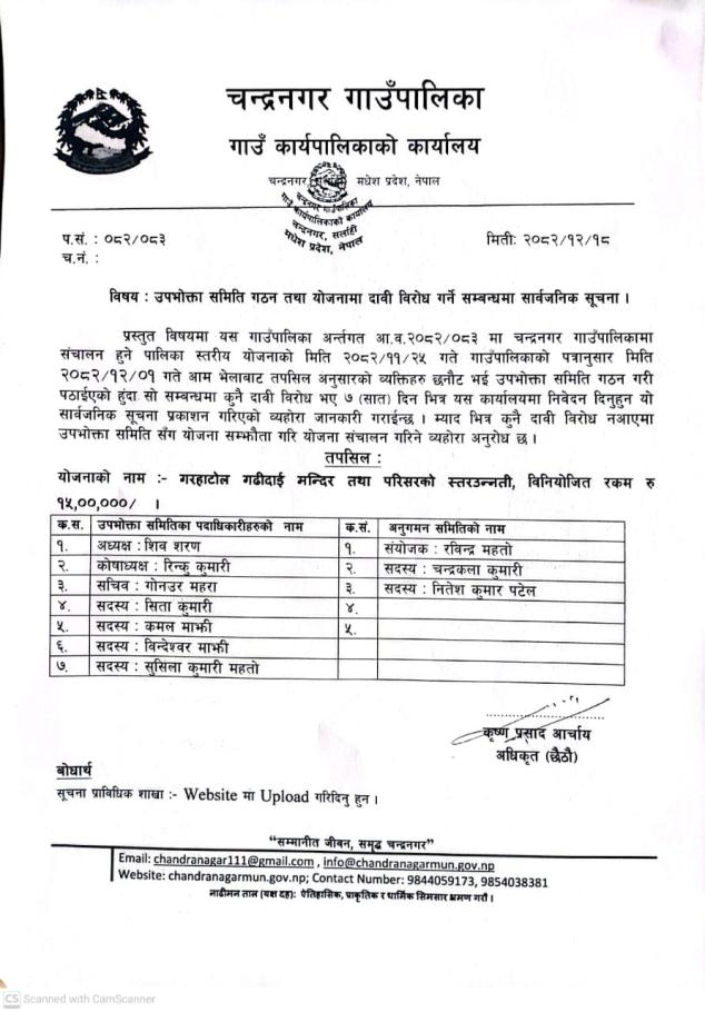 उपभोक्ता समिती गठन तथा योजना दावी विरोध गर्ने सम्बन्धमा सार्वजनिक सूचना