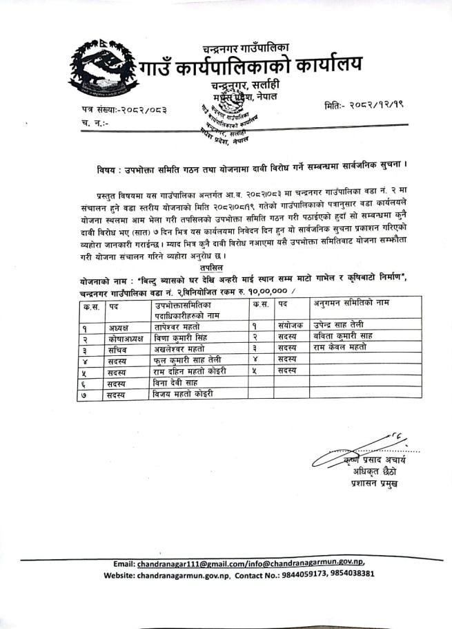 उपभोक्ता समिती गठन तथा योजना दावी विरोध गर्ने सम्बन्धमा सार्वजनिक सूचना