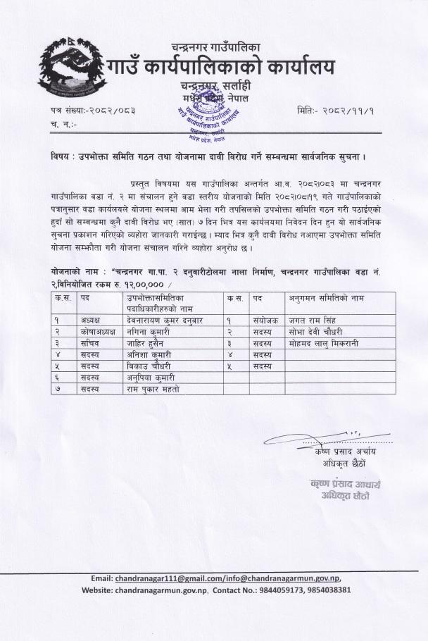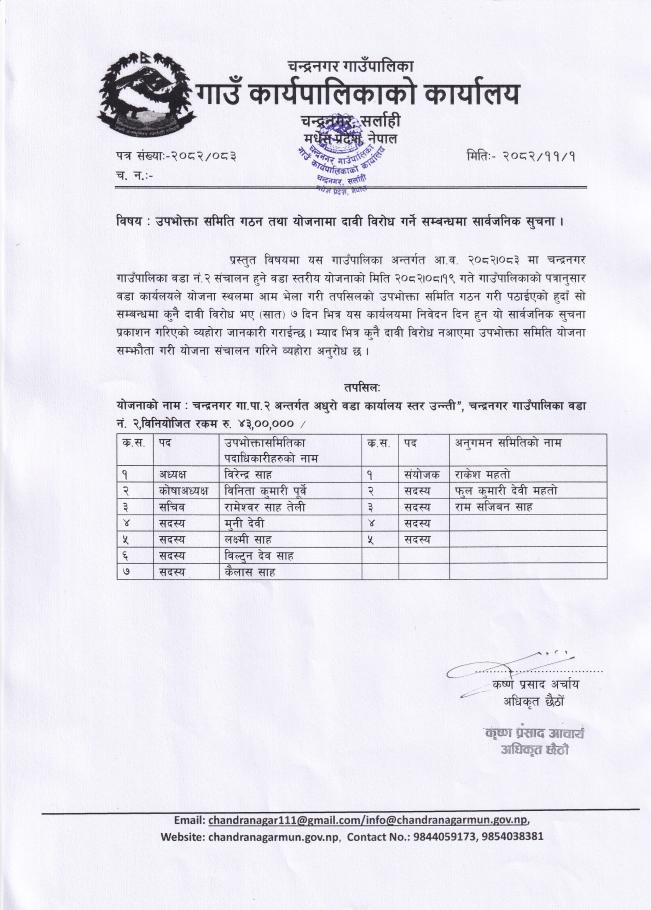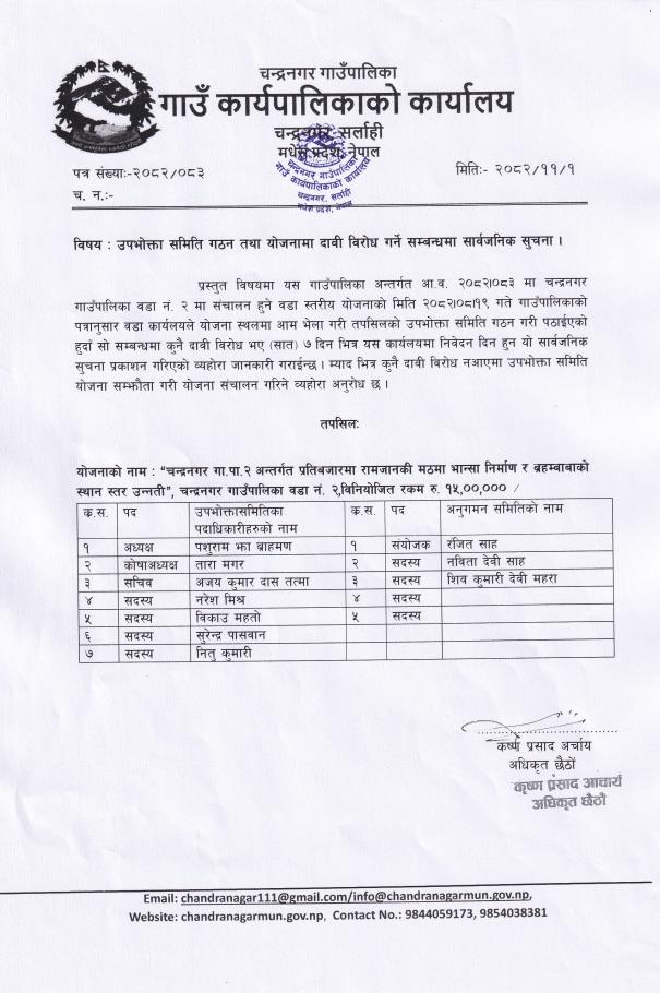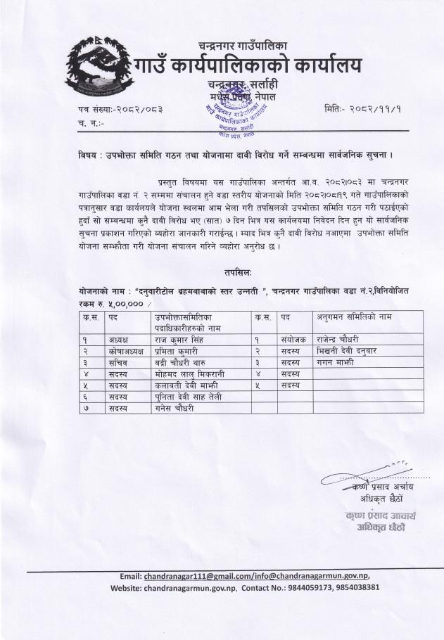 उपभोक्ता समिति गठन तथा योजनामा दाबी बिरोधको सूचना |